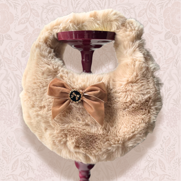 Prachtige handtas van imitatiebont. Heerlijk aaibaar en uitgevoerd met een afneembare fluwelen strik broche. De afmetingen zijn 30x16 cm, excl. het handvat.