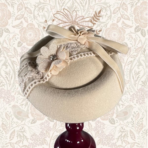 Een plaatje van een fascinator hoedje! Dit prachtige modelletje van 16x14 cm is heel geschikt voor meisjes vanaf 3/4 jaar.  Standaard geleverd op een gouden haarbeugel, zodat het hoedje goed blijft zitten.