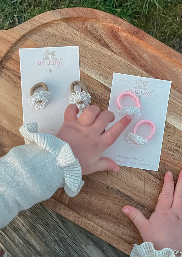 Deze kleine elastiekjes zijn perfect voor vlechtjes of kleine staartjes. Ze zijn er in 2 varianten. Merel met roze elastiekjes en een roze bloemhartje, of Merel met khaki elastiekjes en een gouden bloemhartje!